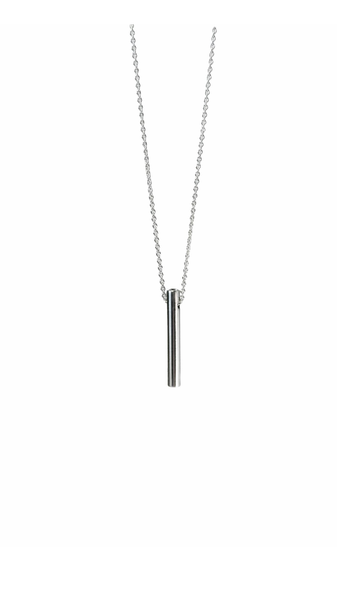 Lítið og nett silfurmen úr línu sem nefnd hefur verið jafnvæi. Menið hangir í 45sm langri silfurfesti og báðum endum þess eru grópaðir zirkonia steinar.